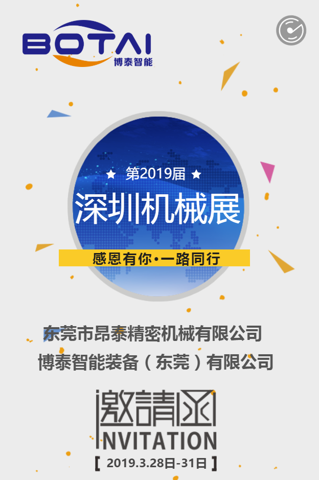 第20届深圳国际机械制造工业展览会 地址:中国.深圳会展中心 展位:8号馆 8C49 现诚邀阁下于2019年3月28日至31日莅临我司展台 参观感谢您的支持 lewin乐玩智能装备(东莞)有限公司
